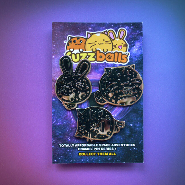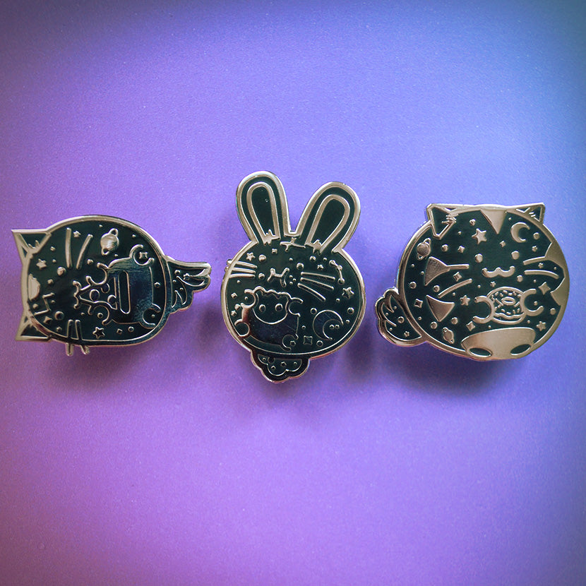 Mini pins of Whisky, Ollie and Timmy looking like the stary sky. Get 3 pins in one collection. Space Series 1 Enamel Pin
